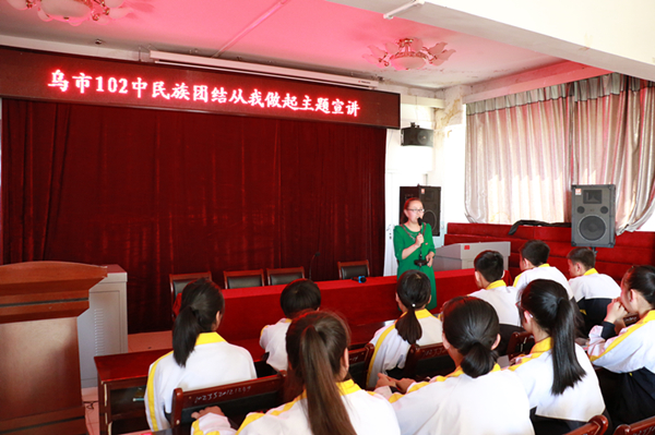 “像爱护自己的眼睛一样爱护民族团结;像珍视生命一样珍惜民族团结、像石榴籽那样紧紧抱在一起”,102中学的会议室里传出一百名学生整齐的声音。这是新疆交通职业技术学院党委宣传部部长叶来·叶尔扎提在给102中学的百名学生开展民族团结宣讲。