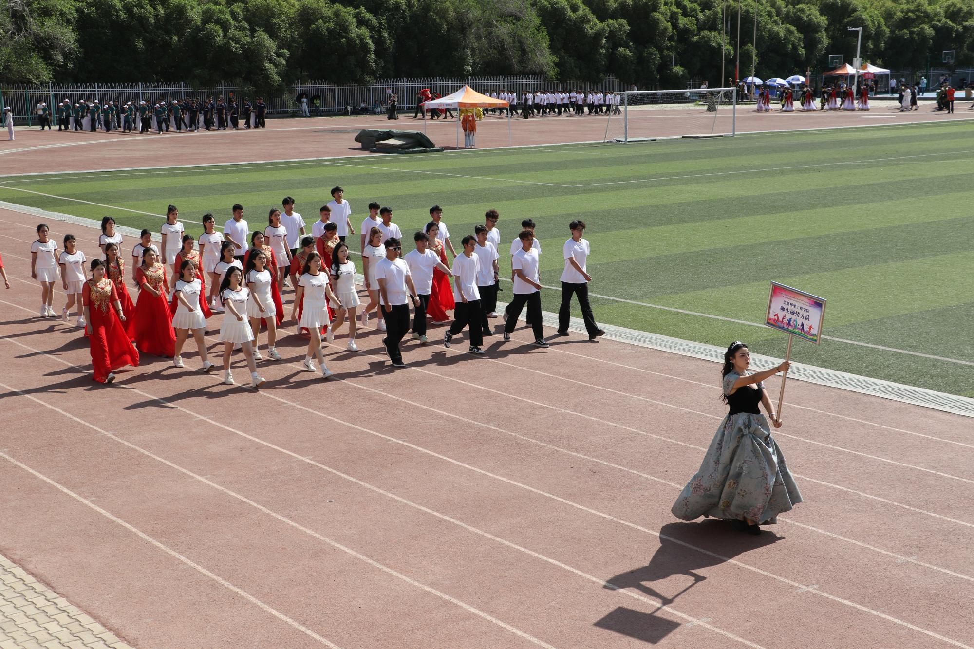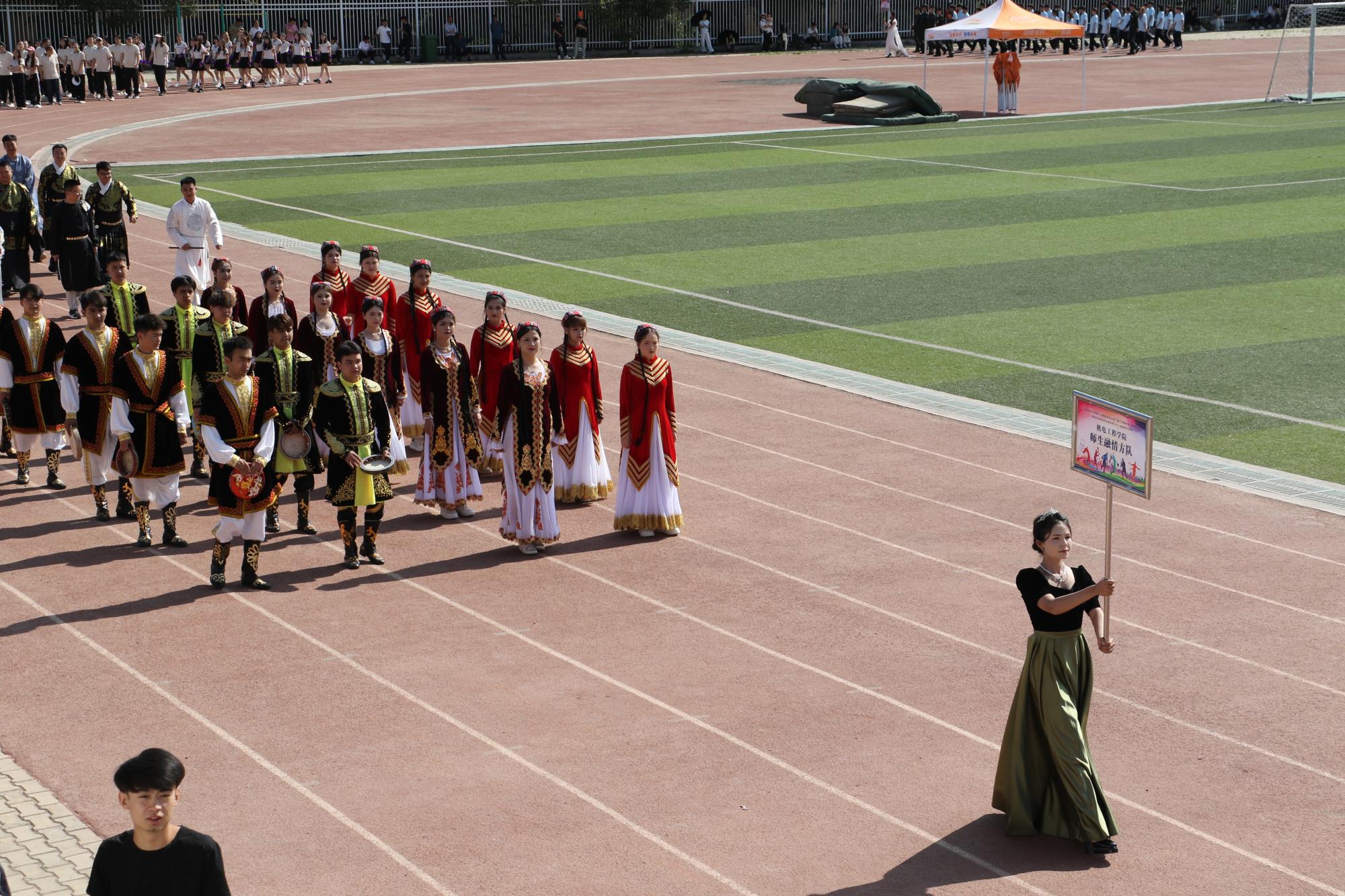 开幕式在激昂澎湃的乐曲声中正式拉开帷幕。首先入场的是国旗队和院旗队,他们步伐坚定、目光如炬,护卫着鲜艳的旗帜稳步前行,尽显庄重与威严。随后,各代表队依次入场,他们迈着整齐划一的步伐,精神抖擞、朝气蓬勃,充分展现出交院学子积极向上的青春风采和勇往直前的昂扬斗志。各二级学院运动员及师生融情方队更是别出心裁,将学院的办学特色和专业风采展现得淋漓尽致,引得现场观众阵阵喝彩。