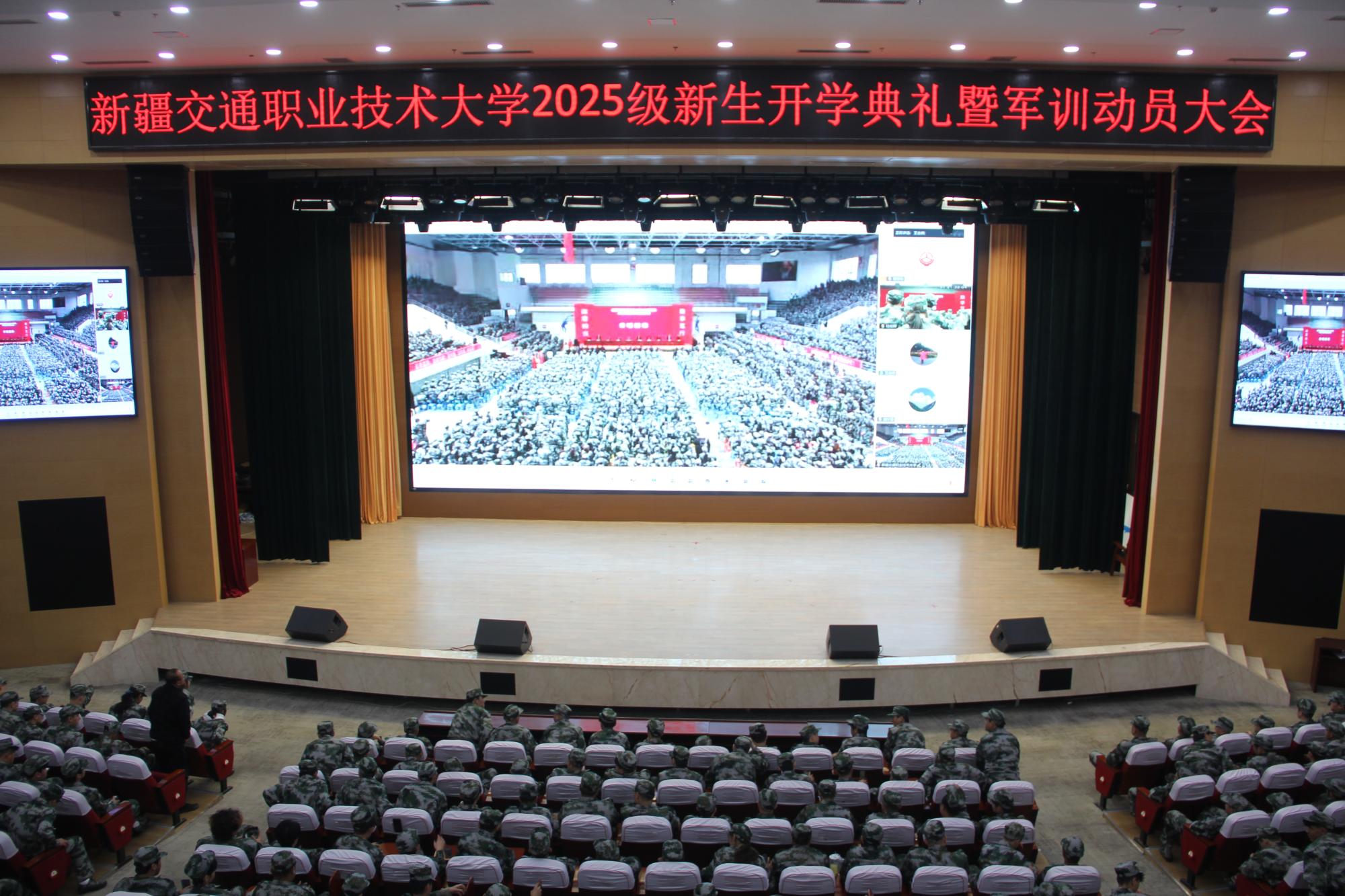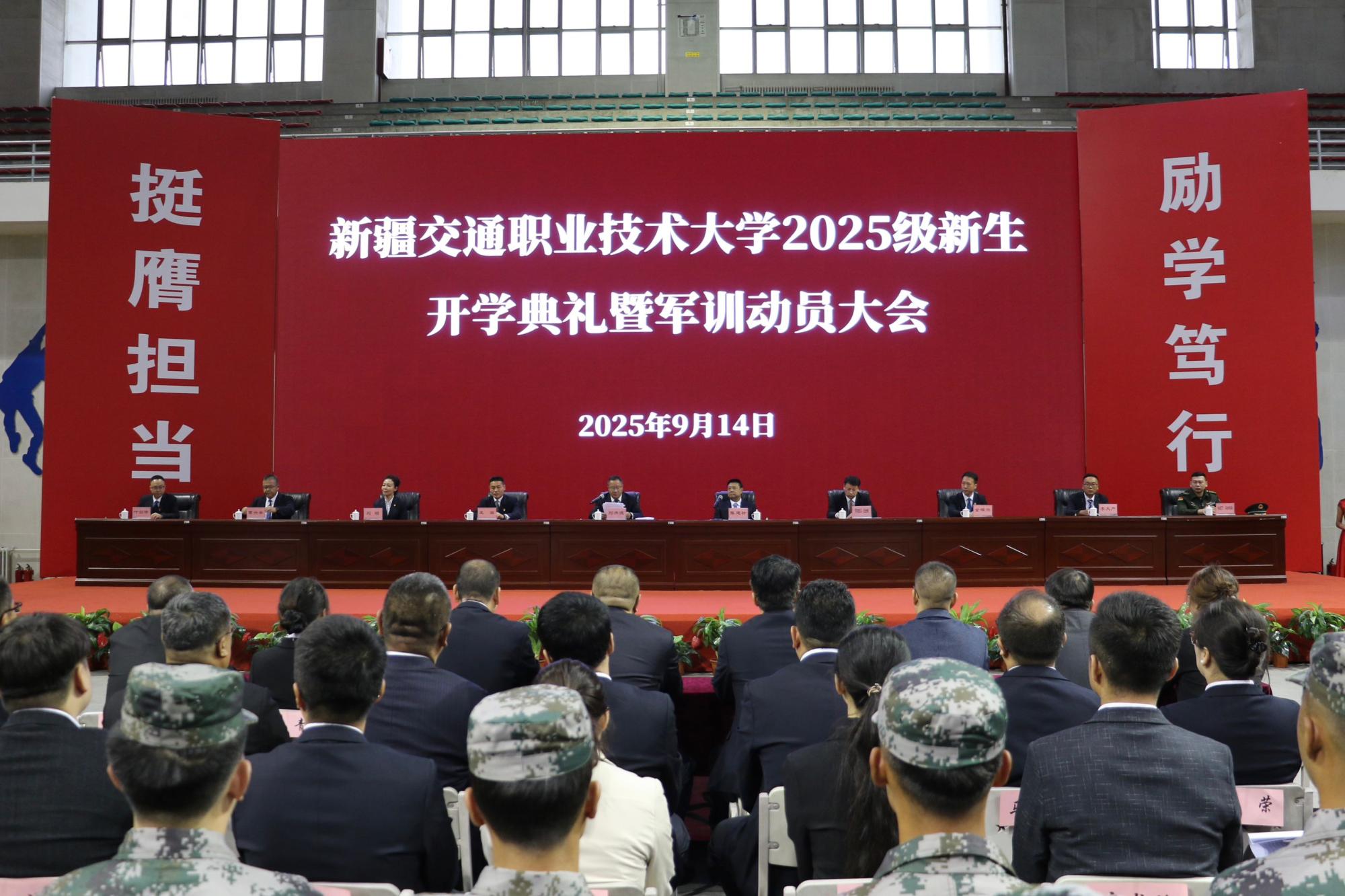 9月14日上午,学校2025级新生开学典礼暨军训动员大会在体育馆主会场与产教融合楼礼堂分会场同步举行。校领导班子成员、米东区人民武装部代表、各部门及二级学院负责人、教师代表、辅导员、新生班班主任、军训教官、2025级全体新生共5700余人齐聚现场,共同见证这一重要时刻。典礼由校党委书记刘洪波主持。