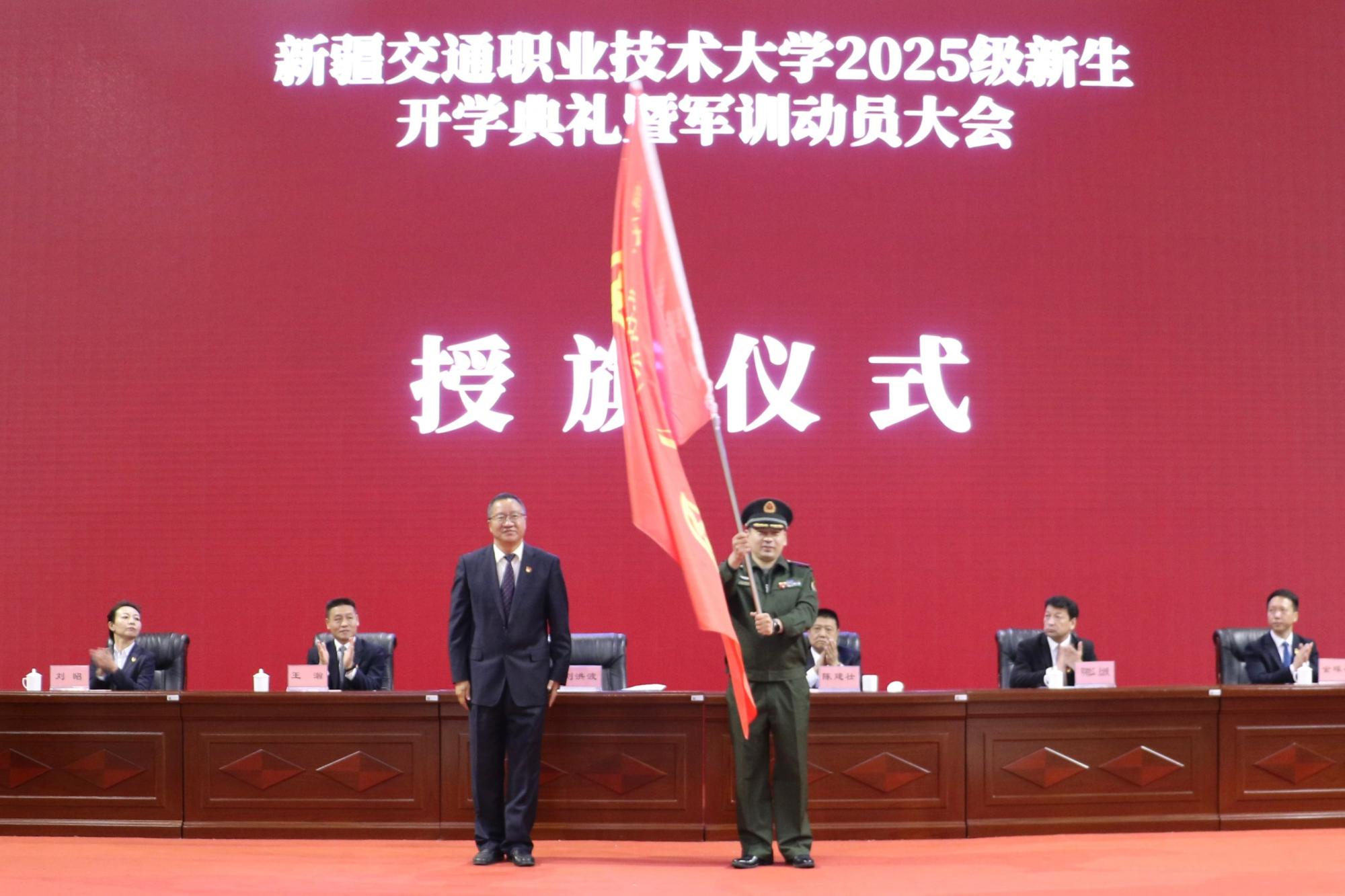 随后举行军训授旗仪式,刘洪波向米东区人民武装部木拉丁·马合木提少校授旗,标志着2025级新生军事训练正式启动。
