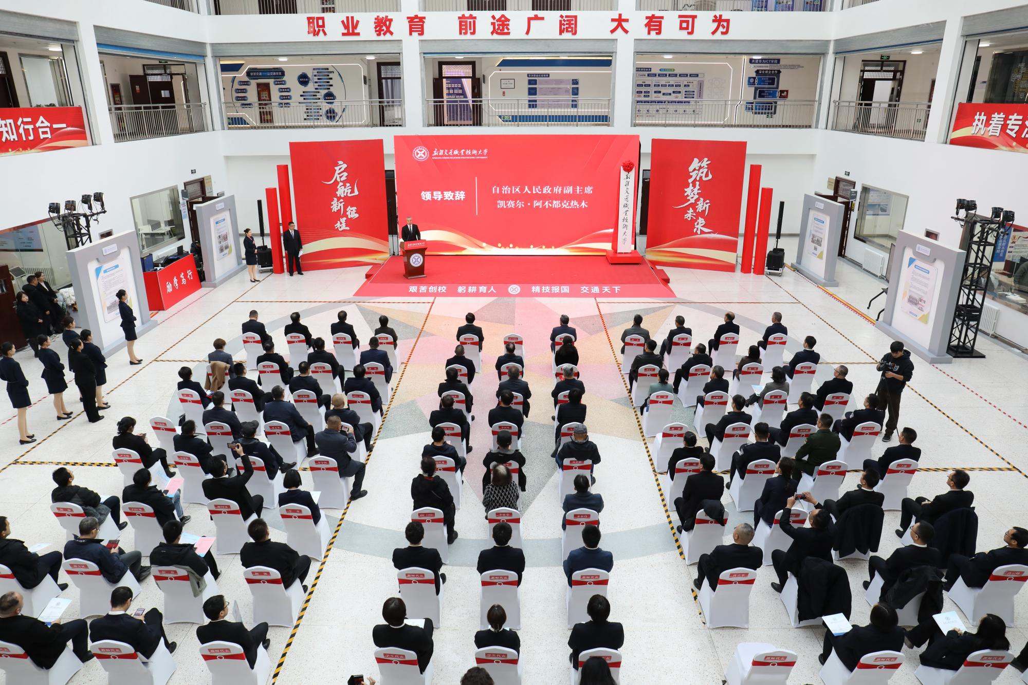 凯赛尔・阿不都克热木在致辞中对ALLWINCITY万象城正式揭牌表示祝贺,对学校七十多年的办学成果给予充分肯定。他指出,学校成功升格为本科层次职业大学,是自治区深化职业教育改革发展的重要成果,必将为构建现代职业教育体系,建设教育强区注入新的强劲动能。同时提出三点希望,一是校准航标,坚持社会主义办学方向毫不动摇;二是坚守本色,牢记为党育人、为国育才的初心使命;三是勇挑重担,全面提升服务国家战略和区域发展的能力水平。强调学校要进一步做强交通特色专业,精准对接新疆铁路、公路、航空等事业发展需求,为自治区经济社会高质量发展提供强大智力支持和人才支撑。