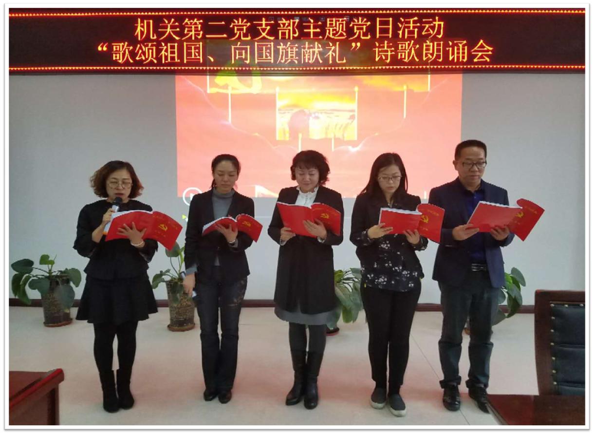 本次活动首先由支部书记带领全体教职工向国旗敬礼,全体党员面对党旗庄严宣誓,重温入党誓词。在活动中,机关第二党支部第一党小组朗诵了《为你祝福 我的祖国》,第二党小组朗诵了《为了明天》,第三党小组朗诵了《祖国,我的母亲》。