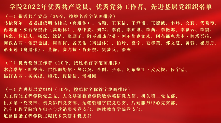 在庆祝中国共产党成立101周年之际,为弘扬正气、表彰先进,树立新时代先进模范榜样,激励学院各基层党组织和广大党员在教育教学、行政管理、后勤服务、安全稳定、疫情防控、安全生产等工作中奋发有为、建功立业,作出更大贡献,经2022年7月1日学院党委会议研究决定:对马依努尔·麦麦提依明等39名共产党员,木合塔尔·吐拉甫等10名党务工作者、人工智能工程学院党总支等10个基层党组织予以表彰,分别授予“优秀共产党员”“优秀党务工作者”“先进基层党组织”荣誉称号。