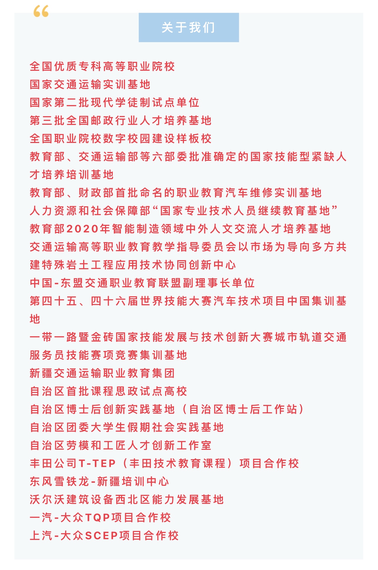 新疆交通职业技术学院始建于1953年,是经新疆维吾尔自治区人民政府批准成立、教育部备案的一所以工科为主,多学科、多层次的公办普通高等职业院校,是自治区唯一一所以培养交通运输类专门人才为主的综合性高等职业院校,隶属于自治区交通运输厅。2004年经教育部批准升格为新疆交通职业技术学院,2010年,学院成为自治区示范性高等职业院校、交通运输部职业教育示范院校,2017年立项建设“自治区优质专科高等职业院校”、2019年被认定为全国200所“优质专科高等职业院校”,跻身自治区职业教育第一梯队,学院发展迈向新时代、踏上新征程。