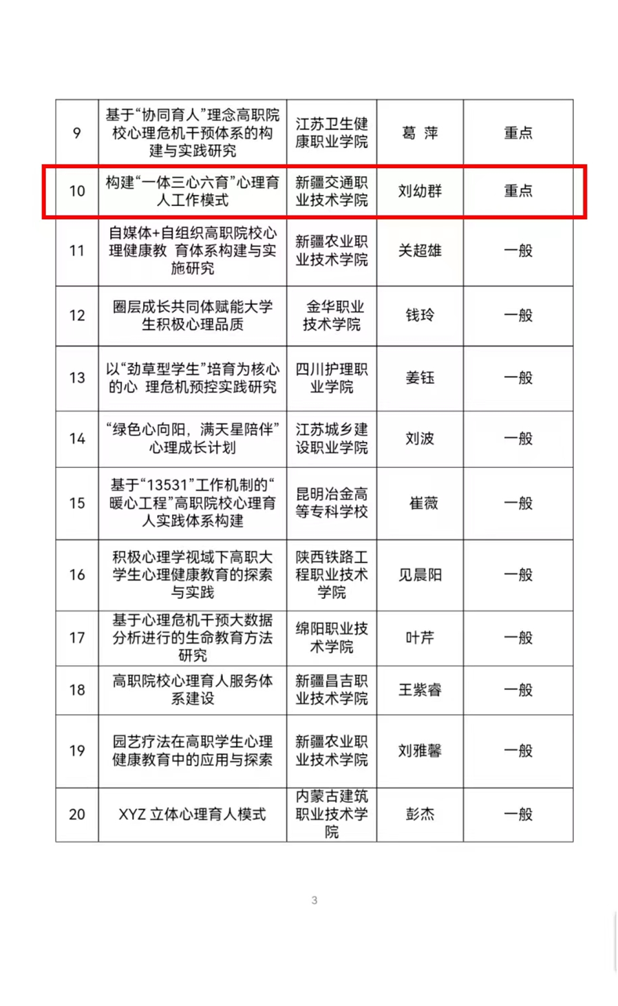 本次项目的成功申报、重点立项,进一步提升了学院大学生心理健康教育工作科学化水平,形成了具有新疆高职特色的心理健康教育工作名片,以项目促进全国心理健康教育工作整体质量和水平的提升。