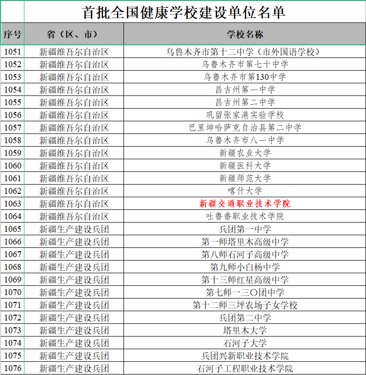 近日,首批全国健康学校建设单位名单公布,新疆交通职业技术学院榜上有名。此次全国健康学校建设单位的评选由教育部组织开展,学校自主申报、各省级教育部门遴选推荐,经组织专家进行条件审核,拟确定1076所学校为首批全国健康学校建设单位。