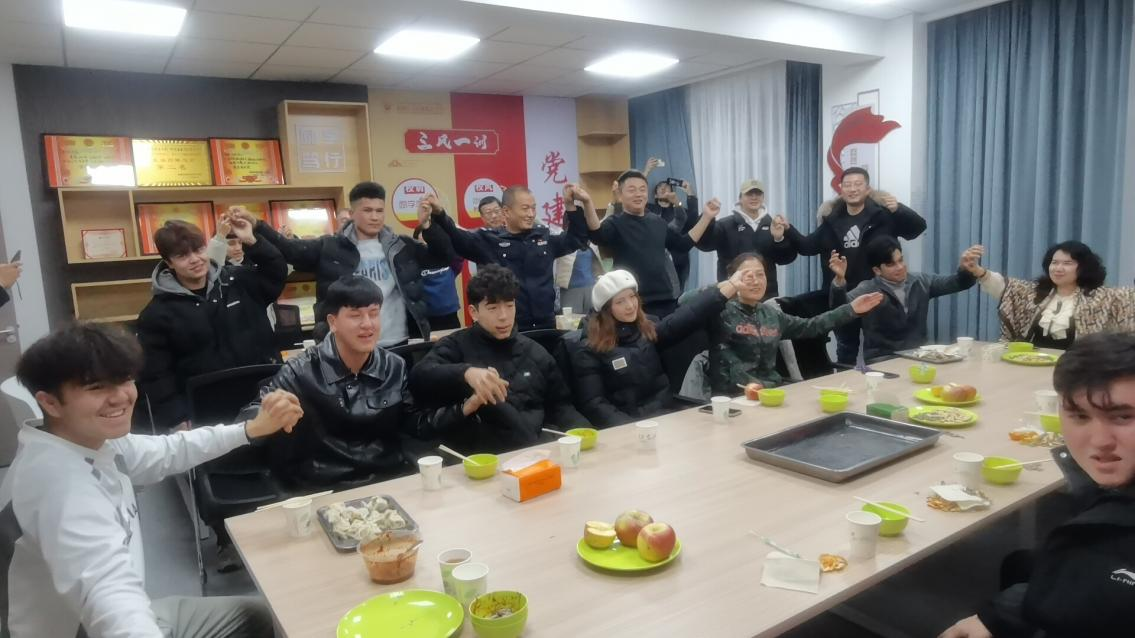 活动讲解了冬至的来历及文化内涵,随后,一盘盘热腾腾、香喷喷的饺子被端上来,结对师生共享美食。阿书记亲切地拉着结对学生努尔艾合麦提·吾舒尔同学的手嘱咐:“要好好复习,争取考一个好成绩,回家要注意安全,要充分利用寒假时间开展大学生实践活动。”活动在结对师生合唱《相亲相爱的一家人》歌声落下帷幕。