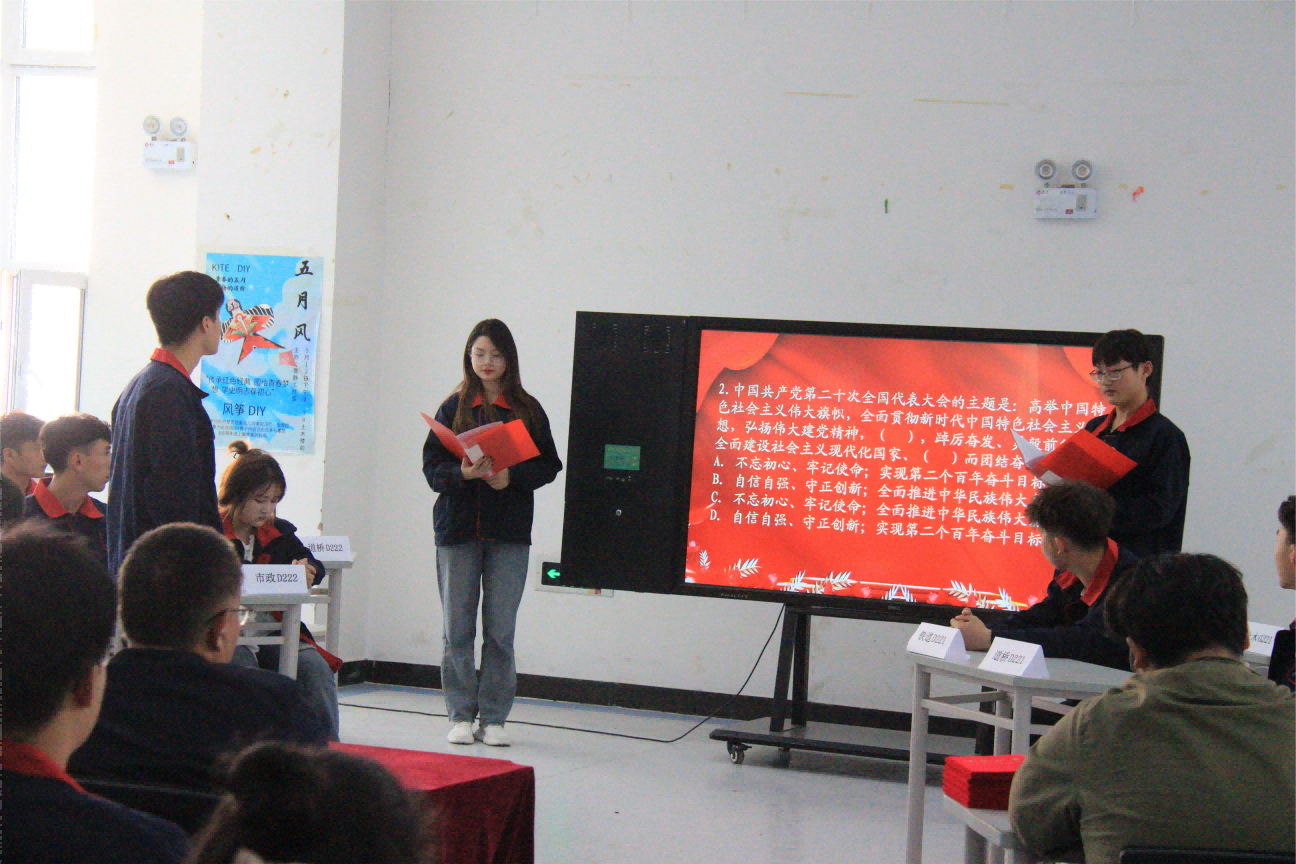 此次知识竞赛由30名班级代表组成的10支班级队伍进行比拼,内容以党史知识为主,分为“勇者大闯关”“抢答题”等环节进行。每位参赛队员聚精会神,仔细聆听主持人的提问,沉着思考,快速应答,充分展现了选手们深厚的党史底蕴与临场反应能力。在第一轮比赛中,养护D221班布吉乃提·托合尼亚孜答题获得满分,将整场比赛的气氛推向了高潮,尽情彰显青年一代勇争第一的青春激情。